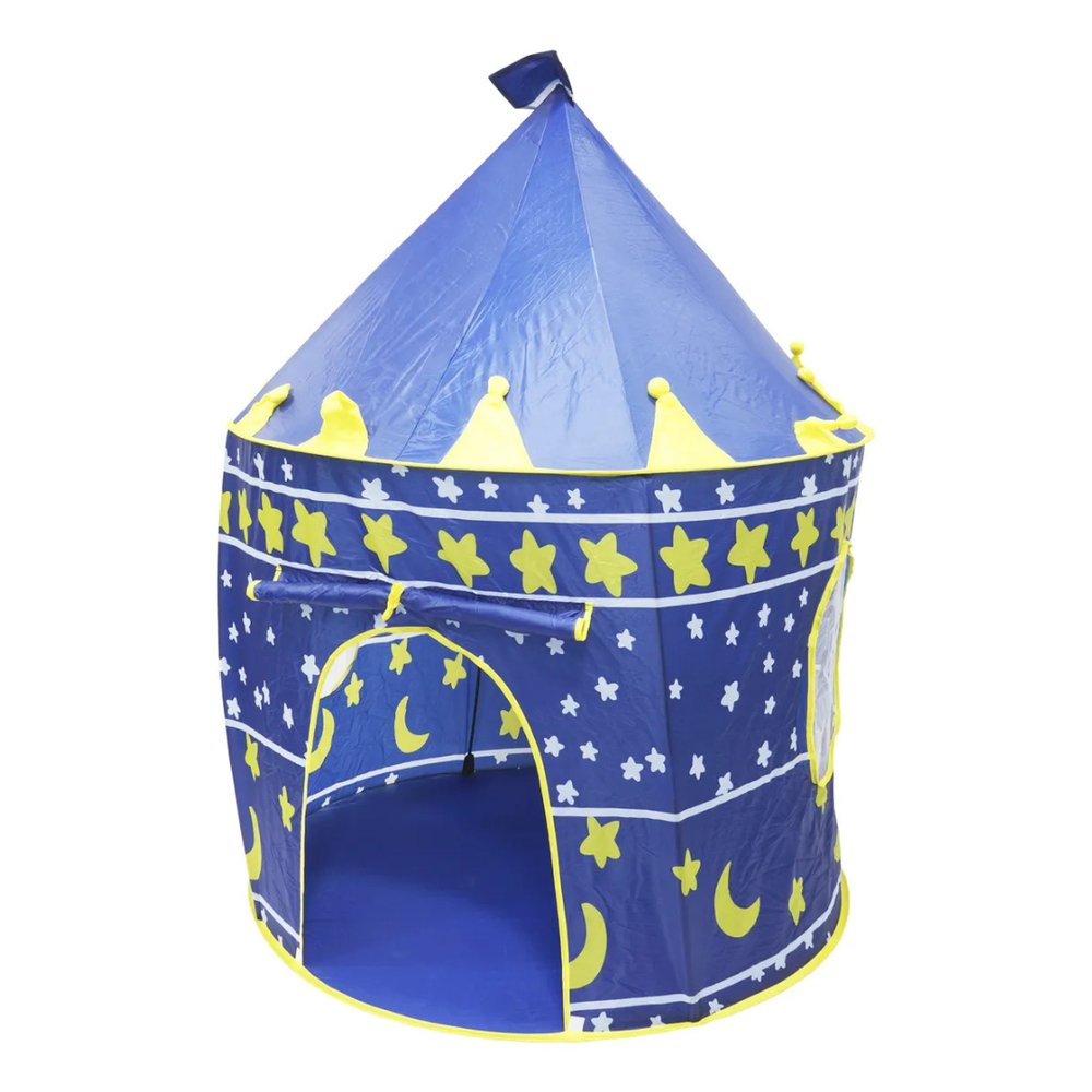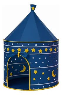 ESPECIFICAÇÕES: Dimensões: 105cm diâmetro x 135cm altura Composição: Tecido sintético leve, varetas plásticas e adesivos decorativos Indicação: Uso infantil em áreas internas e externas Idade recomendada: A partir de 2 anos Peso aproximado: 600g Cor: Azul Registro INMETRO: 004353/2023 CONTÉM: 01 Barraca Infantil Castelo - Azul