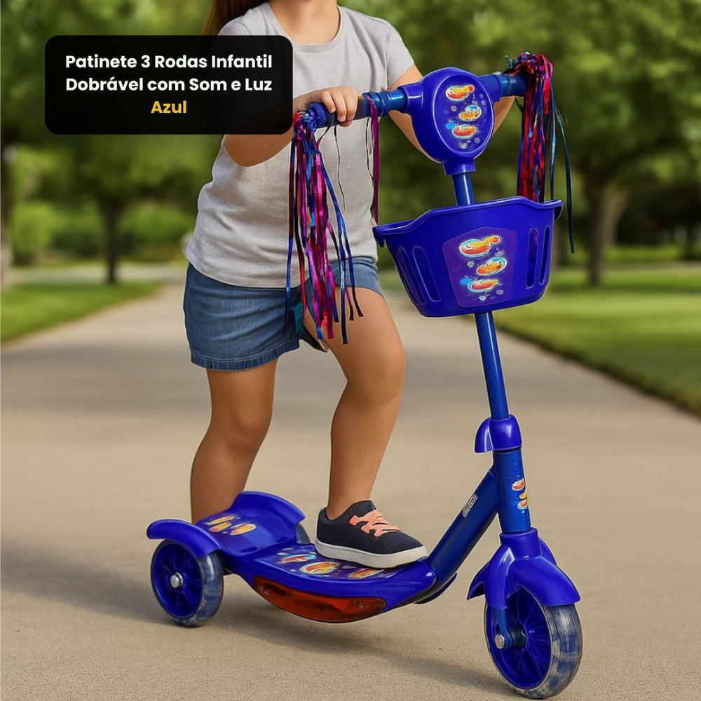 Perfeita para transformar qualquer momento em uma aventura cheia de diversão, música e brilho! Desenvolvido especialmente para crianças, ele oferece segurança, conforto e um design encantador que estimula o movimento e o equilíbrio de forma lúdica e segura. Suas rodas brilham enquanto giram, criando um efeito visual incrível durante o passeio, e o apoio com luz e som torna a brincadeira ainda mais animada, com músicas divertidas que encantam os pequenos. Equipado com cestinha frontal para levar brinquedos e acessórios favoritos, o patinete ainda possui enfeites coloridos nas laterais do guidão, proporcionando um visual alegre e cheio de personalidade. O sistema de freio traseiro acionado pelo pé garante total segurança, permitindo que a criança controle facilmente a velocidade. Fabricado com materiais de alta resistência e acabamento de qualidade, suporta o uso diário e é ideal para atividades ao ar livre, promovendo o desenvolvimento da coordenação motora, equilíbrio e independência. Leve, portátil e fácil de montar, combinação perfeita entre diversão, estilo e aprendizado, tornando-se o presente ideal para crianças que adoram se movimentar e explorar o mundo com alegria e imaginação. Indicado para crianças acima de 3 anos Características do Produto: -Rodas com Brilho -Apoio com Luz Música -Cestinha -Freio nos Pés Especificações: Dimensões: 61cm altura x 24cm largura x 58cm comprimento Composição: Plástico, ferro e alumínio / Rodas: PVC Indicação: Acima de 3 anos Alimentação: 2 Pilhas AA (não inclusas) Capacidade: Até 35kg Cor: Azul Peso: 2,100kg REGISTRO INMETRO: 004351/2023 Contém: 01 Patinete 3 Rodas Infantil Dobrável com Som e Luz - Azul