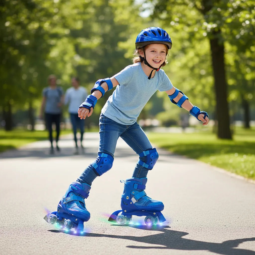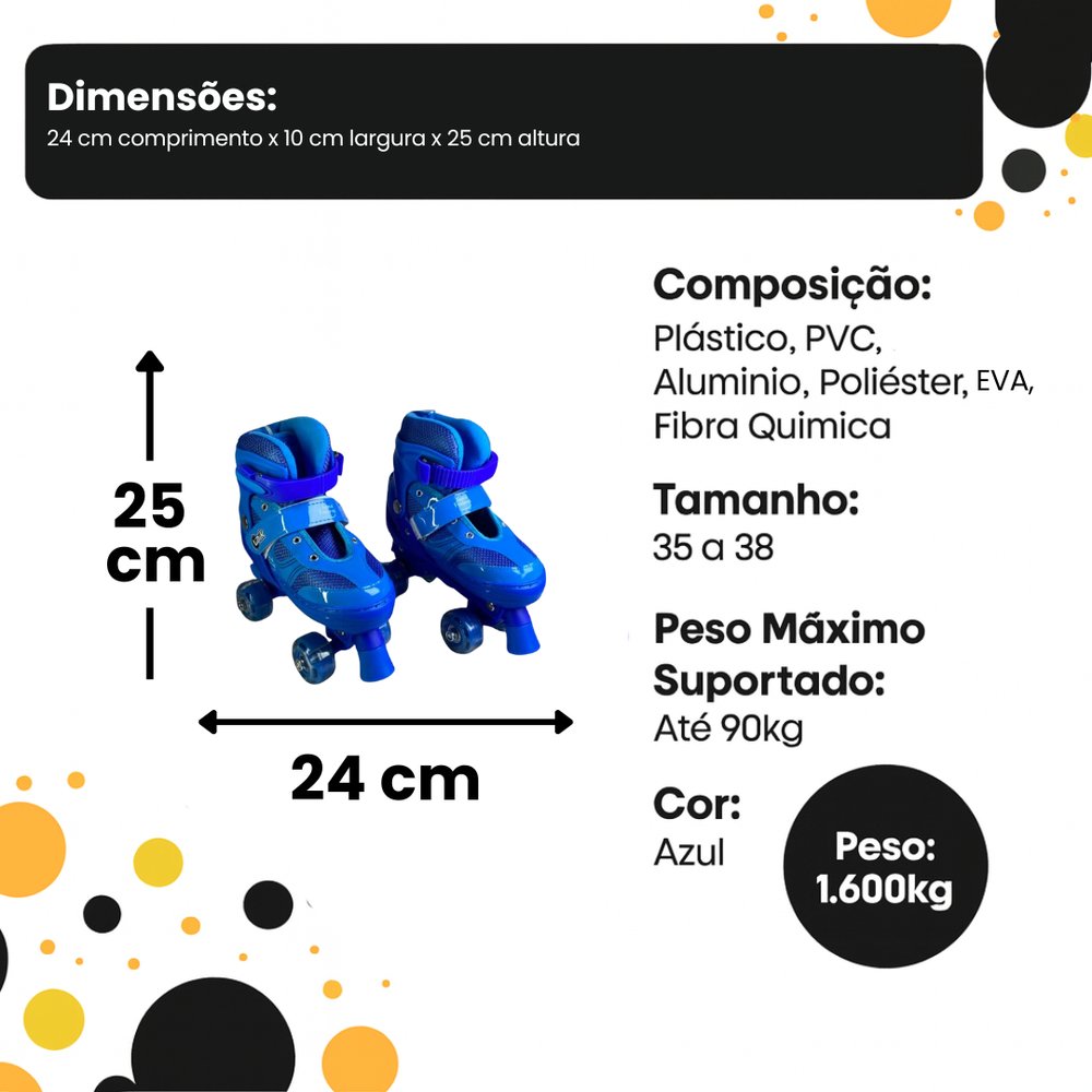 Deixe o dia das crianças ainda mais especial com este super divertido, que conta com 4 rodas de LED que brilham a cada movimento! Com um design inovador e cores vibrantes, este patins não só garante diversão, mas também a segurança necessária para as pequenas aventuras ao ar livre. As rodas iluminadas acendem de forma espetacular quando a criança se move, tornando o passeio ainda mais emocionante e cheio de estilo, especialmente em ambientes com pouca luz. A estrutura é fabricada com material plástico de alta qualidade e tecido resistente, garantindo conforto e durabilidade. Além disso, o ajuste com fecho de velcro oferece praticidade e maior segurança, adaptando-se ao crescimento da criança com facilidade. O tamanho é ajustável, permitindo que o patins acompanhe o desenvolvimento da criança, oferecendo mais tempo de diversão. Recomendado para crianças a partir de 3 anos, ele é perfeito para quem adora praticar atividades físicas, melhorar a coordenação motora e explorar o mundo com muita diversão. No entanto, é importante usar o patins em superfícies planas e evitar terrenos irregulares para maior segurança, proporcionando momentos incríveis de lazer e brilho, sempre com muita diversão e estilo! Itens Inclusos: -01 Par Patins -02 Chave Allen -01 Chave de Boca Especificações: Dimensões: 25 cm altura x 10 cm largura x 10 cm largura x 24 cm comprimento Composição: Plástico, PVC, EVA, Alumínio, Poliéster, Fibra Química Tamanho: 35 a 38 Peso Máximo Suportado: Até 90kg Cor: Azul Peso: 1,600kg REGISTRO INMETRO: 009 031/2022 Contém: 01 Patins Infantil 4 Rodas com LED 35-38 - Azul